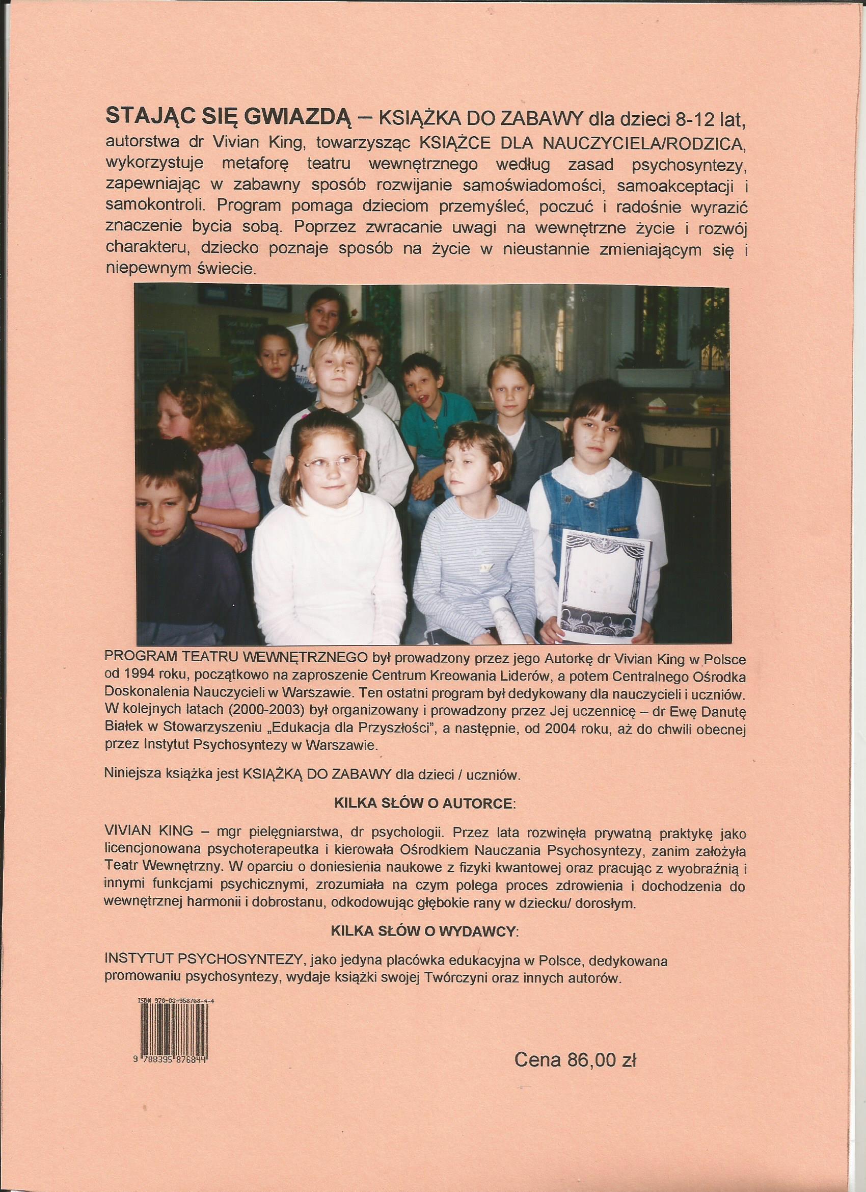 Książka dla dziecka do zabawy, w oparciu o metaforę teatru wewnętrznego (8-12 lat), według zasad psychosyntezy, będąca uzupełnieniem książki dla nauczyciela/rodzica – jako nierozłączne dla zrozumienia siebie i tego, co odbywa się w dziecku z powodu naszych-dorosłych oddziaływań. Pozwala w prosty, zabawowy sposób wyjaśnić nie zawsze proste dramaty w życiu, z którymi potem – u dorosłych – są konfrontowani psycholodzy… i nie tylko….